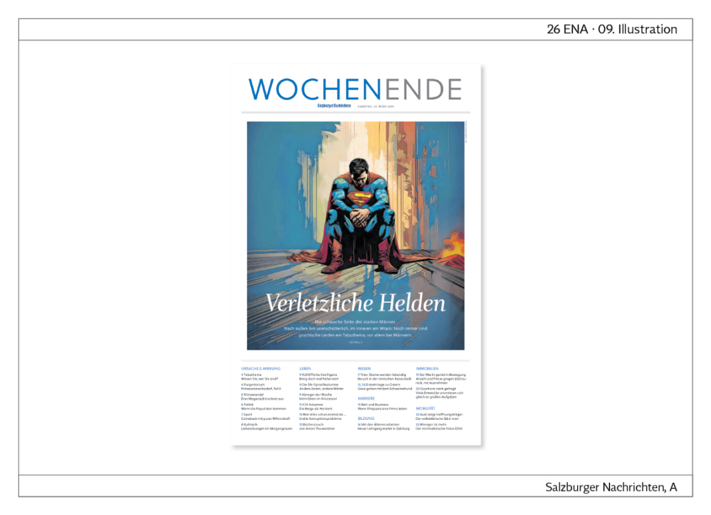 In der Kategorie Illustration werden Arbeiten ausgezeichnet, die das Thema der Story hervorragend visuell präsentieren. Eine Illustration ist beispielsweise eine Zeichnung, ein Aquarell, ein Holzschnitt oder eine Gouache. Sie kann natürich auch am Computer entstanden sein. Fotografien dagegen gehören immer in die Kategorien für Fotografie. Wir zeigen eine Auswahl der ausgezeichneten Seiten.