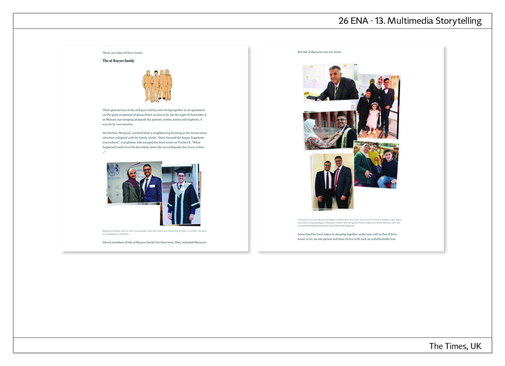 Three generations killed within days: why whole families are dying in Gaza In collaboration with Airwars, The Sunday Times has collated the details of more than 150 families that have lost multiple members in the Israel-Gaza war at the time of publication. Following these families stories, using animated gifs and an interactive component to explore the data we put a face and a face to the numbers. LINK